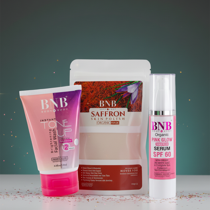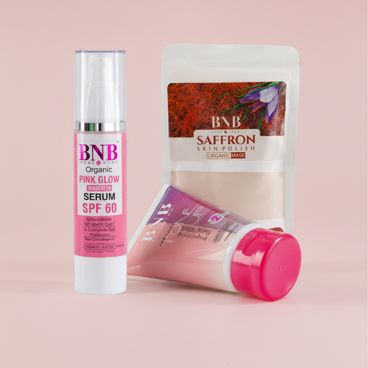 تتضمن مجموعة "بينك جلو" ثلاثة منتجات رئيسية: غسول الوجه "بينك جلو" من "بي إن بي"، وقناع الوجه "سافرون"، وعامل حماية من الشمس "بينك جلو". صُممت هذه المجموعة لتنظيف بشرتكِ وتفتيحها وحمايتها، لتمنحها لمسة نهائية مشرقة ومتألقة.