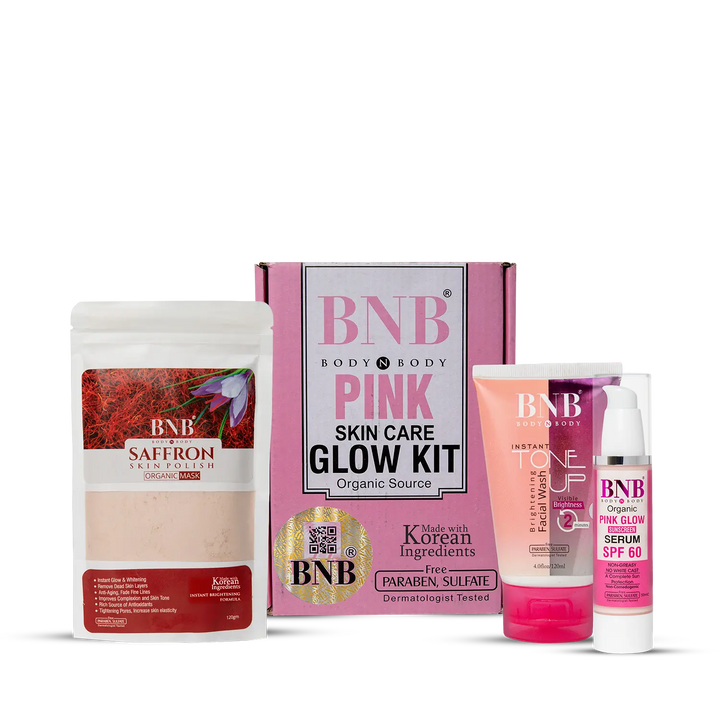 The Pink Glow Kit includes three key products: BNB Tone Up Facewash, Saffron Face Mask, and Pink Glow SPF. This set is designed to cleanse, brighten, and protect your skin, leaving it with a radiant and glowing finish.